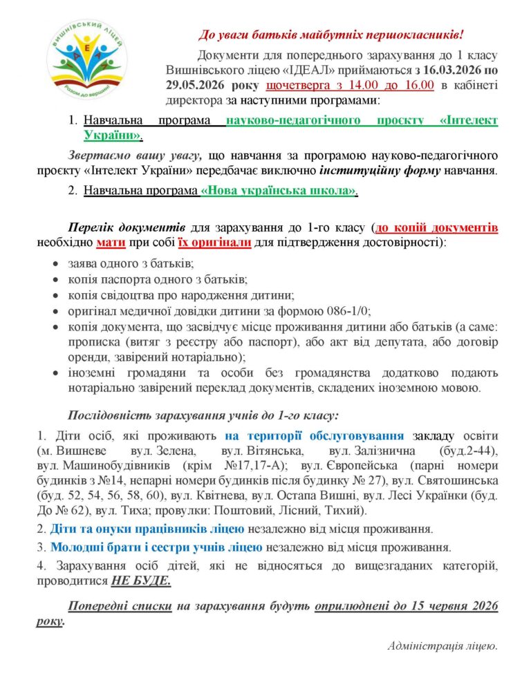 Шановні батьки! Документи для попереднього зарахування (дата початку оприлюднюється додатково) до 1 класу Вишнівського ліцею «ІДЕАЛ» приймаються за наступними програмами: